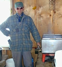 The syrup becomes more concentrated as it moves from the far end of section "a" through section "b" then into the small tank "c" and finally is at its most concentrated in section "d". The evaporator can be used to produce the correct concentration, 66 brix, but we have found that the operation runs more smoothly if we do the final finishing in the propane pan. We normally draw off the syrup from section "d" when the brix content is around 50. In the picture above, Martin is about to check the syrup in section "d" to see if it is ready to transfer to the propane pan.
