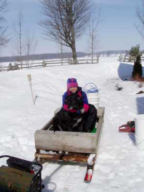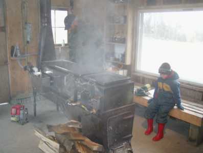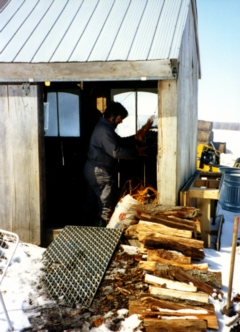 It was a fine little shack albeit a little drafty on cold winter nights even with the stove stoked to a cherry red. It's no wonder there were a few close calls with fire. One in particular occurred during a much too enthusiastic newspaper read. The paper had blocked my view of the evaporator and when I put it down I saw that the entire opposite wooden wall was a sheet of flame. The old dry barn boards had reached their critical temperature and were now ablaze. There was a moment's hesitation as I reached for the pail of sap - you have to experience collecting sap in more than knee deep snow to appreciate why the reaction was not immediate - to douse the flames. All was saved though, and we learned to wet down the boards each evening.