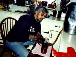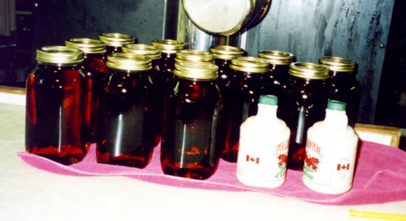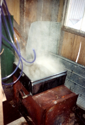 In the following years, Pierre's sap was augmented with sap from Anne Marie Roussy who brought her surplus to us for custom boiling. In the Spring of 2000 our little evaporator produced more than 400 litres of syrup.! One good tap should produce 1 litre of syrup so now we were at double the assigned capacity of our evaporator!