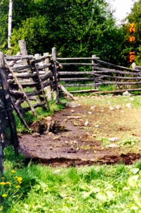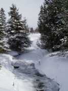 When the first ram pump was installed in 1993 we also installed a gravity feed system to supply water to our mature cows during the winter. Prior to this installation the cows had accessed the Noisy river directly via a small side stream that had been constructed before we purchased the farm in 1972. As with the ram pump, we used the natural fall of the river as it flowed through the farm and placed a 4" plastic tile line in the stream until we had reached a height above our water station of about 3 feet. In retrospect we should have gone further up the river to create a greater head of water and we would have been able to place the water tank further from the stream.