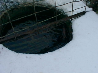 To prevent freezing of the water during the winter we used a 3 foot concrete well tile cemented at its base with in inlet and an outlet as shown on the diagram. This tile was then encased in a concrete pad.